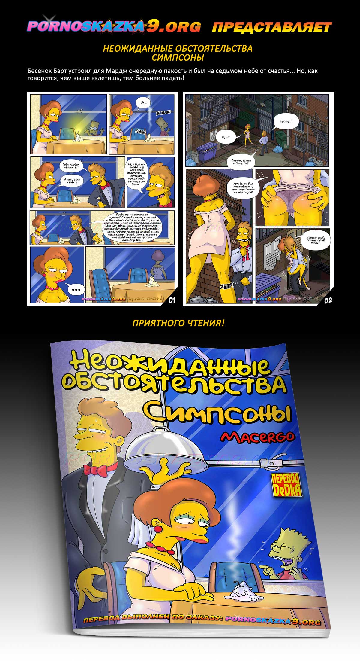 Порно комикс «Неожиданные обстоятельства. Симпсоны.» Бесенок Барт устроил для Мардж очередную пакость и был на седьмом небе от счастья… Но, как говорится, чем выше взлетишь, тем больнее падать!